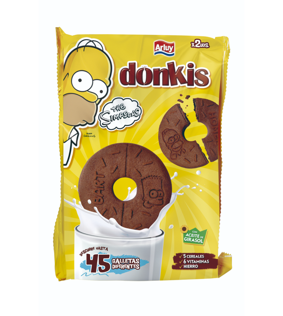 Una galleta de chocolate en forma de rosquilla con un agujero en medio y decorada con los Simpsons. ¡Una innovación crujiente y divertida que en manos de los niños será como un juguete!